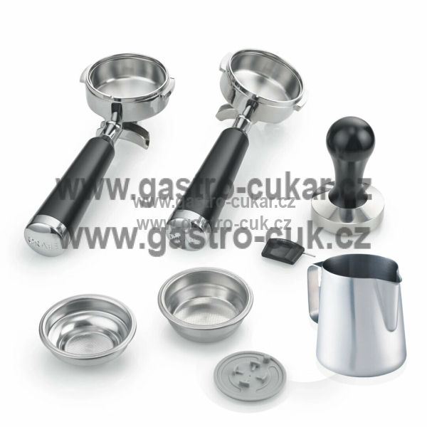 - Tamper, slepý košík, konvička na mléko a čistící pomůcky